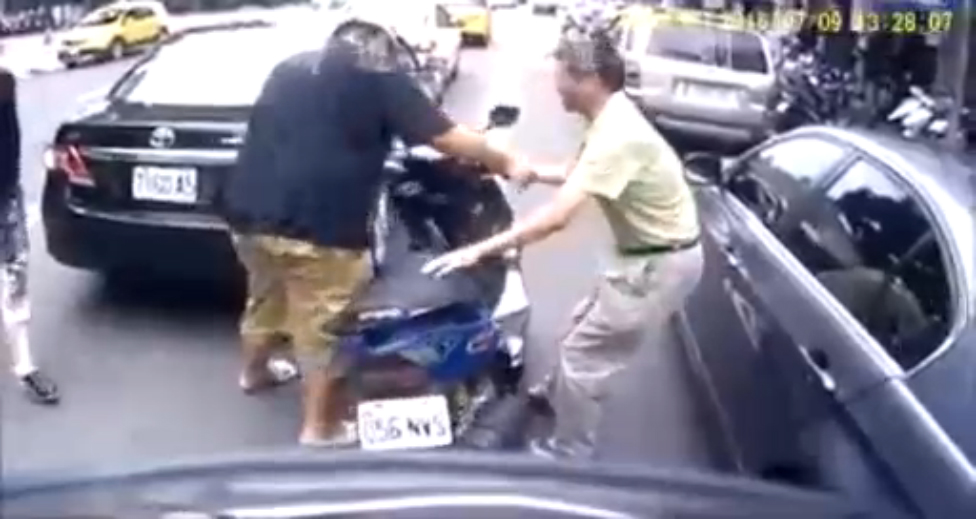 Мужик сбил скутериста, открыв дверь своего авто и решил помочь поднять скутер и накрутил ручку газа, от чего скутер поехал сам. #прикол#азия#авто#мото#идиот