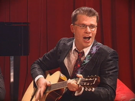 Встретившиеся барды обсуждают Картошинский фестиваль, в котором они недавно принимали участие, и поют свои новые песни.