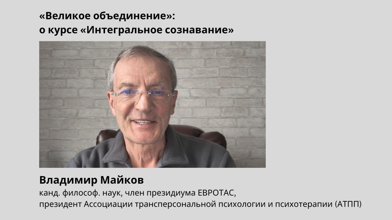 Первопроходец трансперсональной психологии и психотерапии Владимир Майков рекомендует долгосрочный курс Евгения Пустошкина и Татьяны Парфёновой «Интегральное сознавание», посвящённый интегральному AQAL-подходу Кена Уилбера, теориям и практикам вертикального развития личности, интегральной медитации и интегральной психологии. Сайт интегрального курса: http://integralmeditation.ru/course Владимир Майков — кандидат философских наук, ст. научный сотрудник сектора аналитической антропологии Института философии РАН; доцент, руководитель программ по трансперсональной психологии и психотерапии Московского института психоанализа. Основоположник холотропного дыхания в России. Первый российский сертифицированный преподаватель метода холотропного дыхания и трансперсональной психологии. Сертифицированный специалист по процессуальной работе. Сертифицированный психотерапевт Всемирного совета по психотерапии, Европейской ассоциации психотерапии и Европейской трансперсональной ассоциации. Супервизор профессиональных программ по трансперсональной психотерапии в России. Основатель и лидер «Трансперсонального проекта». Президент Ассоциации трансперсональной психологии и психотерапии (АТПП). Член Президиума EUROTAS (Европейской трансперсональной ассоциации). Официальный преподаватель международного класса Общероссийской профессиональной психотерапевтической лиги. Кинорежиссер, автор 3-х документальных фильмов о развитии человека и около 100 интервью с ведущими мировыми экспертами по этой теме. Книгоиздатель, опубликовавший множество книг по интегралистике и трансперсонологии.