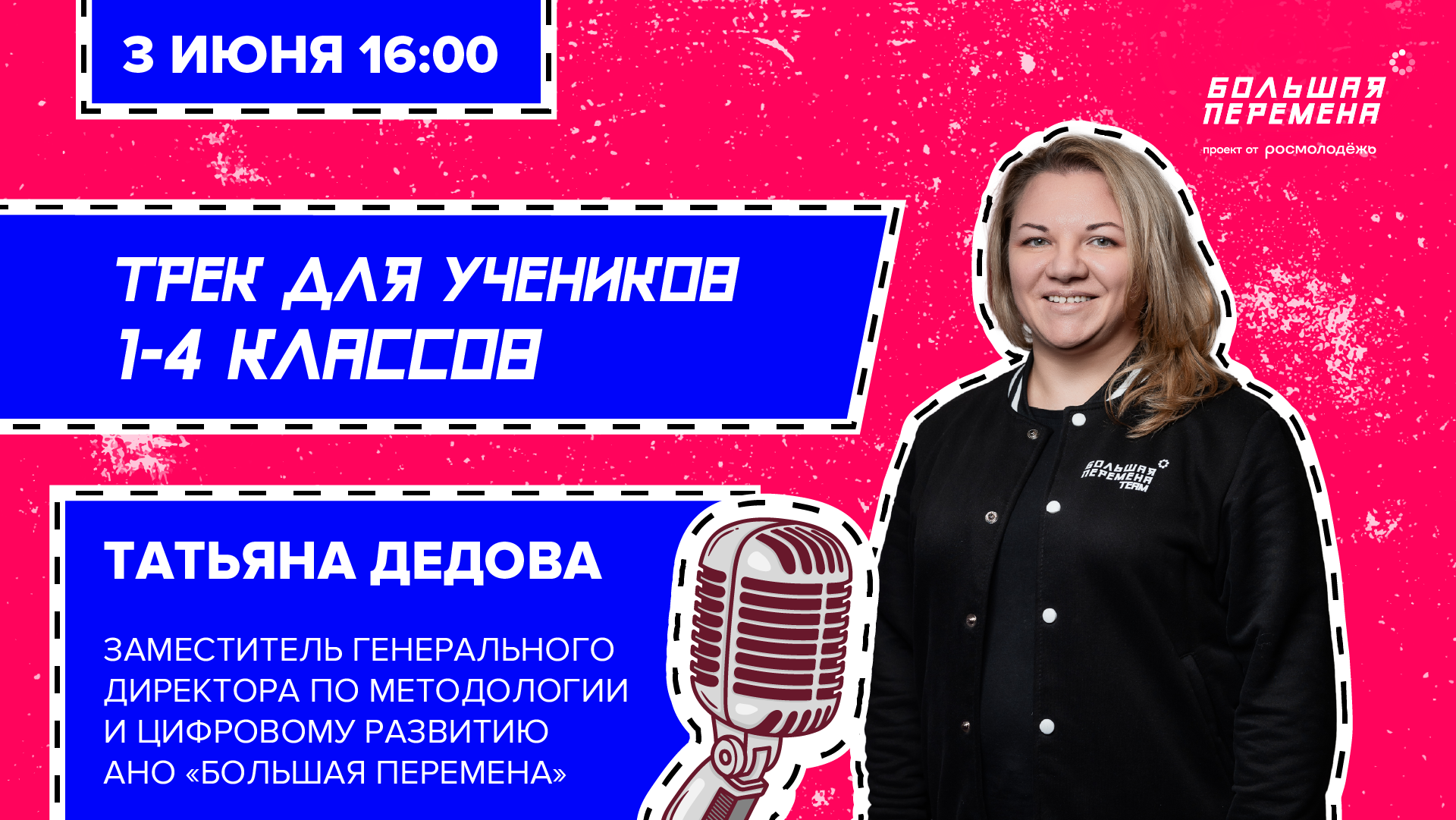🎬Ученики 1-4 классов и их родители, приготовиться! Совсем скоро вы вступите в игру под названием «Большая перемена». А чтобы сыграть успешно, нужно чётко знать правила. Их вам расскажет заместитель генерального директора по методологии и цифровому развитию АНО «Большая Перемена» Татьяна Дедова. Тема её нового эфира «Трек для учеников» 1-4 классов. Все свои вопросы ты можешь задать в комментах под этим постом, а трансляция состоится 3 июня, в 16:00. #БольшаяПеремена #ХорошиеНовости