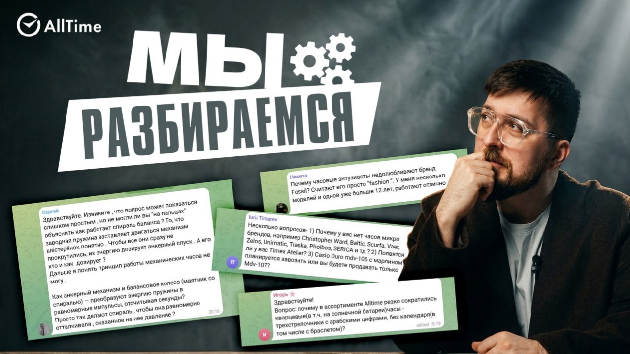 Мы собрались и разобрались! Сделали видео с ответами на вопросы наших подписчиков, и теперь планируем делать это регулярно. Встречайте первый выпуск рубрики «МЫ РАЗБИРАЕМСЯ». ✅Наш блог о часах: https://www.alltime.ru/blog/?utm_source=yt&utm_medium=smm&utm_campaign=main_m Подписывайтесь на наши социальные сети: Телеграм: https://t.me/alltimeru VK: https://www.vk.com/alltimeru OK: https://www.ok.ru/group/53744904896525 Дзен: https://zen.yandex.ru/alltime TikTok: https://vm.tiktok.com/ZSakRbMv/ ⌚AllTime. ru Работаем с часами с 1994 года! AllTime — это крупнейший интернет-магазин и розничные салоны по всей России. Более 25 000 позиций наручных часов в наличии. Благодаря многолетнему опыту работы и отличному знанию индустрии часов, мы предлагаем покупателям только оригинальные мужские и женские наручные часы от известных мировых производителей, следим за новостями рынка и пополняем ассортимент актуальными новинками. Кроме того, в нашем ассортименте аксессуары, ювелирные украшения и подарки от самых популярных брендов. Кликай по ссылке и выбирай: https://www.alltime.ru?utm_source=yt_m&utm_medium=smm&utm_campaign=main