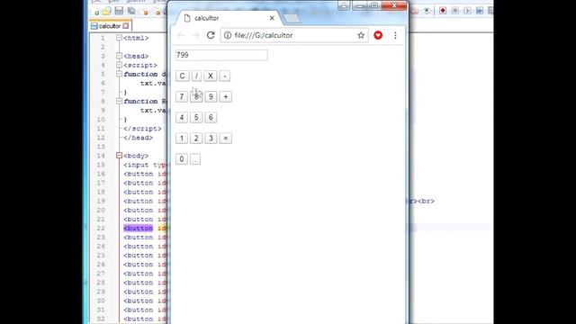 PLEASE LIKE,SHARE AND SUBCRIBE MY CHANNEL!! *Coding*: <script> function display(a){ txt.value=txt.value+a } function Reset(){ txt.value=null; } </script> </head> <body> <input type="text" id="txt" style="text-align:right"/><br><br> <button id="c" value="c " onclick="Reset()">C</button> <button id="divi" value=/ onclick="display(divi.value)">/</button> <button id="mul" value=* onclick="display(mul.value)">*</button> <button id="Sub" value=- onclick="display(Sub.value)">-</button><br><br> <button id="b7" value=7 onclick="display(b7.value)">7</button> <button id="b8" value=8 onclick="display(b8.value)">8</button> <button id="b9" value=9 onclick="display(b9.value)">9</button> <button id="add" value=+ onclick="display(add.value)">+</button><br></br> <button id="b4" value=4 onclick="display(b4.value)">4</button> <button id="b5" value=5 onclick="display(b5.value)">5</button> <button id="b6" value=6 onclick="display(b6.value)">6</button><br></br> <button id="b1" value=1 onclick="display(b1.value)">1</button> <button id="b2" value=2 onclick="display(b2.value)">2</button> <button id="b3" value=3 onclick="display(b3.value)">3</button> <button id="equal" value= = onclick="txt.value=eval(txt.value)">=</button><br><br> <button id="b0" value=0 onclick="display(b0.value)">0</button> <button id="dot" value=. onclick="display(dot.value)">.</button> </body> PLEASE LIKE,SHARE AND SUBCRIBE MY CHANNEL!!