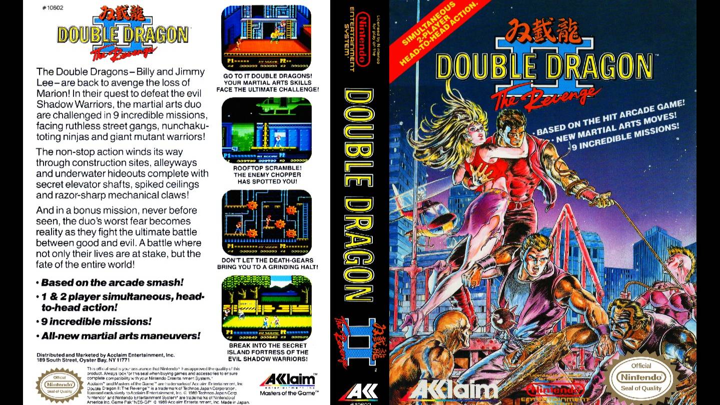 "DOUBLE DRAGON 2: THE REVENGE" ("ДВОЙНОЙ ДРАКОН 2: РЕВАНШ") - видеоигра в жанре beat 'em up, разработана TECHNOS для аркадных автоматов в 1989 году. Вторая игра из серии, портирована на множество других платформ: NES, SEGA, GAME BOY. Версии для консолей существенно отличаются от аркадной из-за технической ограниченности последних. Игра начинается с убийства Мэриан из оригинальной "DOUBLE DRAGON" лидером группировки Black Warriors. Билли и Джимми Ли отправляются вершить месть. В аркадной версии, как и во всех портах, игровой процесс одинаков и является стандартным для beat 'em up-игр. Игрок выбирает одного из героев и, управляя им, проходит линейные уровни, методично избивая нападающих группами врагов. В конце почти каждого уровня игроку необходимо победить босса. Персонаж может использовать посторонние предметы и оружие в бою, например, палки, пистолеты, биты. В аркадной версии игрок также может восполнять здоровье, находя еду в мусорных баках или ящиках. В отличие от первой части, в игре имеется два способа кооперативного прохождения: в режиме A игроки не смогут наносить друг другу урон, в режиме B - могут. Есть три уровня сложности, в американской версии задающие длину игры; финальный уровень доступен только на самом сложном из них. В версии NES девять миссий, против четырёх в аркадной версии; заменены некоторые противники. Между уровнями идут сюжетные вставки. Девятая и заключительная миссия представляет собой сражение с "Таинственным злодеем", введённым в версии NES в качестве финального босса. Версия NES имеет более счастливый конец, в котором Мэриан приходит в чувство после того, как финальный босс умирает.