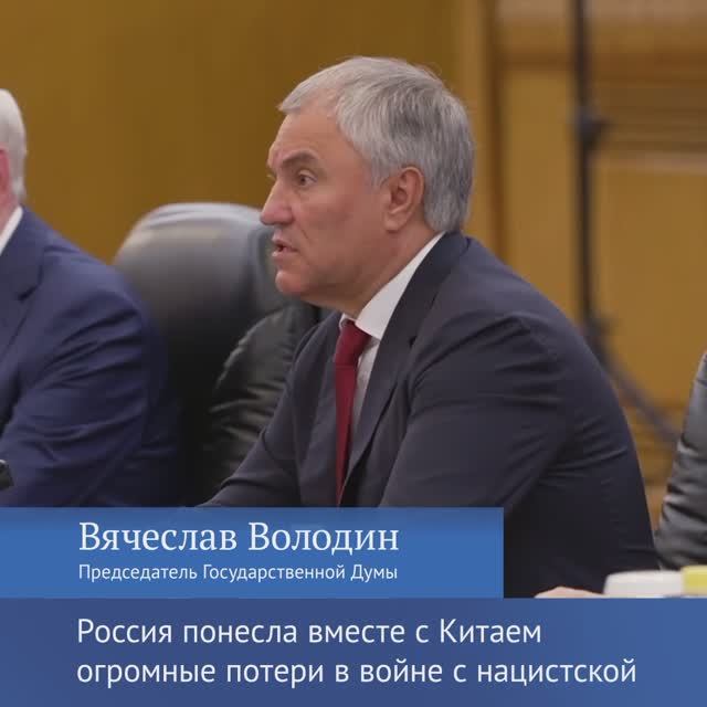 Смотрите плейлист Новости политики https://rutube.ru/plst/921867 Председатель ГД Вячеслав Володин на встрече с Председателем КНР Си Цзиньпином отметил, что Россия и Китай понесли огромные потери в войне с нацистской Германией и Японией. «Поэтому мы вместе отмечаем День Победы. Понимаем, насколько далась тяжело эта победа, какой ценой, и поэтому очень важно, чтобы мы помнили победителей, помнили тех, кто пожертвовал свою жизнь, чтобы сегодня мы могли развиваться, планировали будущее», – сказал он. Председатель КНР также отметил вклад обеих стран в победу во Второй мировой войне над германским фашизмом и японским милитаризмом. Ранее, открывая заседание Межпарламентской комиссии по сотрудничеству Федерального Собрания РФ и Всекитайского собрания народных представителей, Вячеслав Володин отметил, что общая история и подвиги обязывают Россию и Китай делать «все для укрепления друг друга, ведя диалог на принципах доверия».