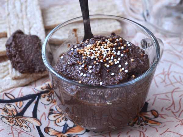 ецепт постного шоколадного мусса: Нут - 2 стакана Шоколад (постный) - 100 г Соль - 1 щепотка Грецкие орехи - для подачи