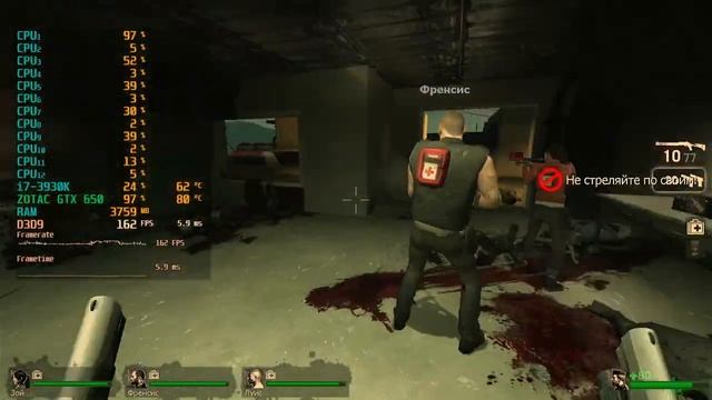Game: Left 4 Dead Сomputer characteristics: Socket: LGA 2011 Motherboard: Asus Sabertooth X79 Processor: i7 3930K 3.20GHZ RAM: HYPER X 16GB DDR3-DIMM 1600 GPU: ZOTAC GTX 650 GDDR5 2GB ROM: SSD 128GB+HDD 500GB Video in 1920x1080 resolution. Operating system: Windows 10 Pro
