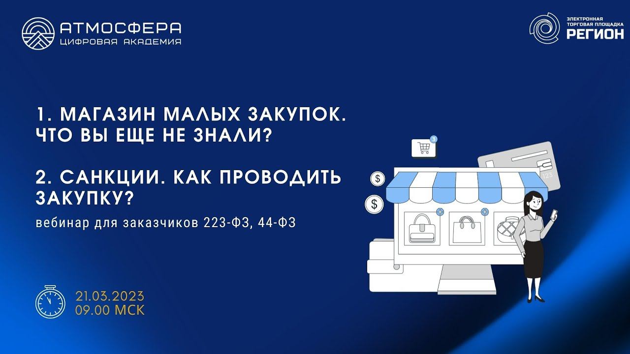 Подписывайтесь на нас в социальных сетях, чтобы не пропустить свежие новости: https://academy-atmosphere.ru/zakupki https://t.me/academy_atmosfera https://vk.com/academy_atmosfera https://rutube.ru/channel/24606397/ 00:00 Вступление 02:18 Приветствие спикера Сафину Светлану Дамировну 03:15 Все, что вы хотели знать о магазине малых закупок 04:50 Закупка у ЕП 09:10 Закупка у ЕП - 44ФЗ 15:59 Предварительное предложение 21:04 Извещение 24:15 Алгоритм процедуры 25:43 Заключение контракта по результатам закупки 26:40 Проект федерального закона №314175-8 от 14.03.2022 30:52 Обжалование "малых" закупок в эл. форме по ч. 12 ст. 93 31:37 Неконкурентная закупка - 223-ФЗ 32:34 Условия проведения неконкурентных закупок у СМСП в электронном магазине 36:45 Обжалование "малых" закупок в эл. форме по 223-ФЗ 38:10 Резюме 40:30 Ответы на вопросы участников 57:46 Работа в малом магазине на ЭТП Регион 01:11:09 Приветствие спикера Маслову Елену Александровну 01:11:28 Санкции. Как проводить закупку? 01:14:02 Перечень санкций 01:15:11 Влияние санкций 01:19:52 Антисанкционные меры 01:21:57 ЭТП для Заказчиков под санкциями 01:23:25 Изменения 2023 СМП 01:25:10 Требования к участнику 01:26:30 Поддержка предпринимательства 01:27:39 Санкции для поставщика 01:31:09 Изменение условий контракта 223-ФЗ 01:34:03 Изменение условий контракта 44-ФЗ 01:35:00 Административная ответственность(44-ФЗ) 01:36:19 Определение верховного суда РФ от 15.04.2022 по делу №А04-4646/2021 01:36:37 РНП 01:37:29 Способы закупок Заказчика по ПП301 01:39:10 Реестр договоров (ПП301) 01:39:36 Закупка обязательного аудита 01:40:30 Планирование 01:41:43 Ответы на вопросы участников