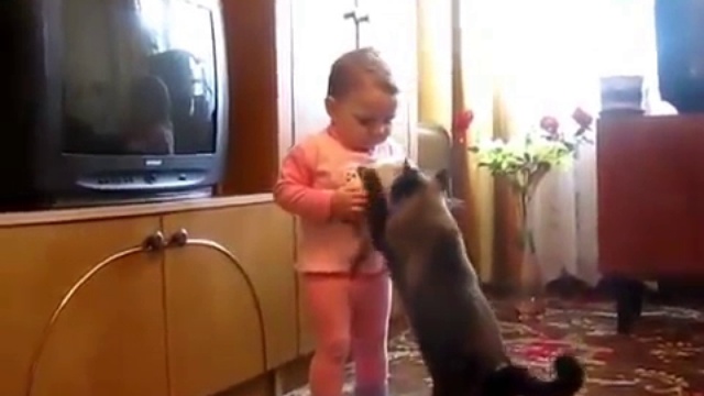 Кошка забирает котенка у малыша. Очень красиво она это делает, что б не обидеть...