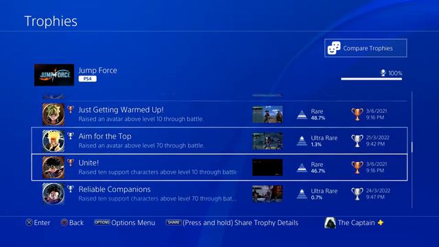 Game: JUMP FORCE (PS4) Trophy Difficulty: 5/10 Playthrough: 1 Hours: 70 Online Trophies: 6 (Base Game) Offline Trophies: 44 (Base Game) Missable Trophies: No DLC Trophies: No Link to Trophy Guide: https://psnprofiles.com/guide/10037-jump-force-trophy-guide My PSN Profile: https://psnprofiles.com/CaptainChurrr IMPORTANT NOTE: As of February 8, 2022, the game will be delisted on the PSN Store, making it impossible to buy the game digitally. As of August 24, 2022, the servers will shut down, making the platinum unobtainable. #playstation #platinumtrophy #jumpforce