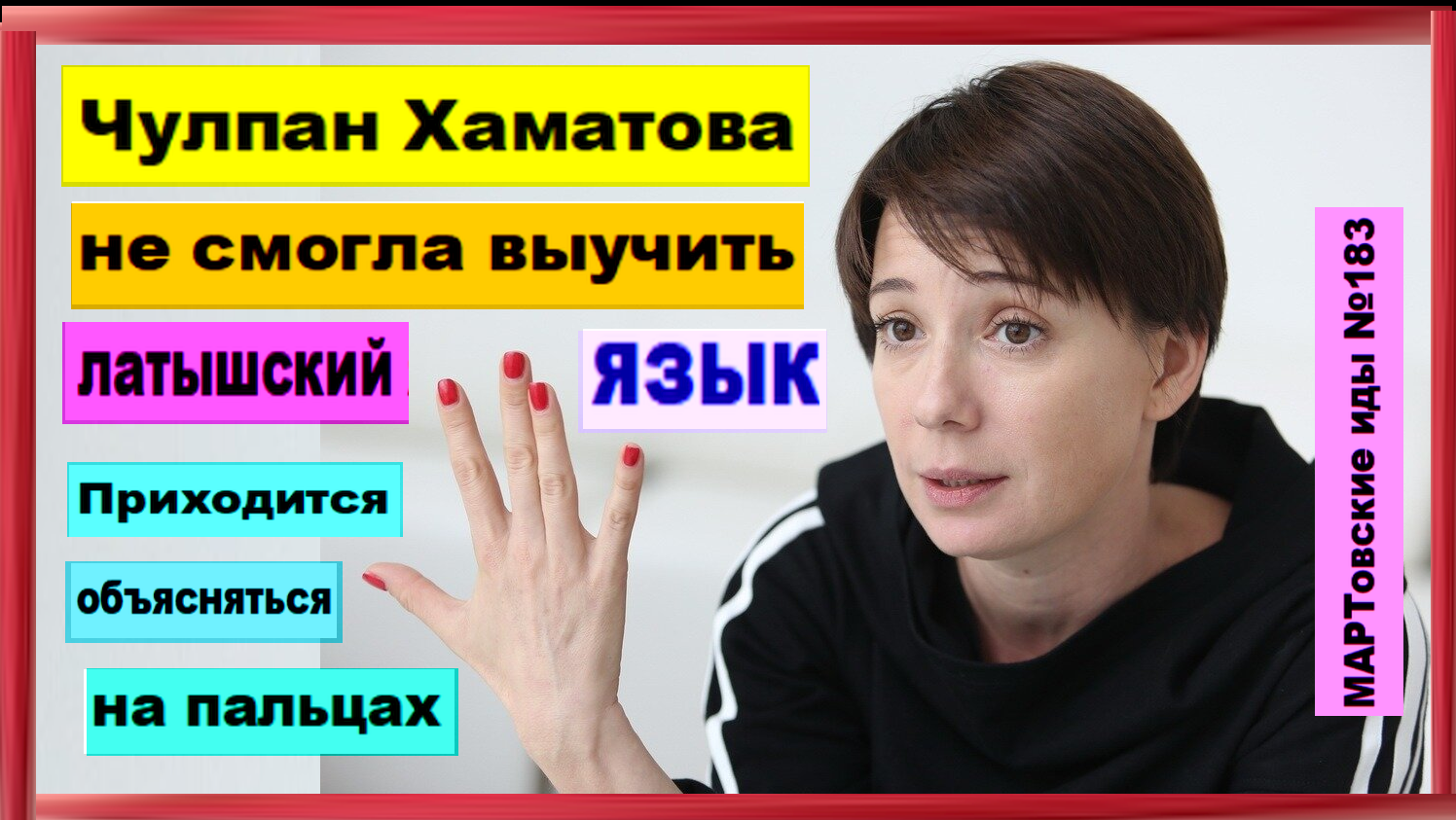 «Чулпан Хаматовой так и не смогла выучить латышский язык. Увы, приходится объясняться на пальцах». Такова тема сегодняшнего выпуска новостей в рамках постоянной рубрики «МАРТовские иды №183». Как сообщает рижский новостной портал «Дельфи», народная актриса России ответила на вопросы передачи "Открытый разговор" на Латвийском радио. Как известно, о своём решении переехать в центральную республику Прибалтики Чулпан Наиловна объявила ещё в начале прошлого года. Как сегодня артистке живётся вдали от родных краёв? Что её беспокоит больше всего? Кроме того, Чулпан Хаматова объяснила, почему в 2012 году поддержала президента России Владимира Владимировича Путина. А еще она прокомментировала ситуацию, связанную со спектаклем "Gogolis. Nature morte" по "Старосветским помещикам" Николая Васильевича Гоголя. Увы, постановку отменили буквально накануне премьеры с формулировкой "творческая неудача". «С латышским языком у Хаматовой нет проблем, - утверждают в Новом рижском театре. Так что что же случилось? См. видео в тему «Чулпан Хаматовой не смогла выучить латышский язык. Увы, приходится объясняться на пальцах». Ждём комментарии!