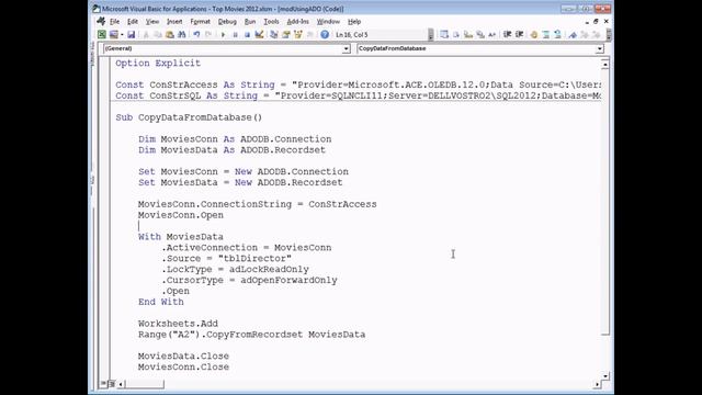 If you'd like to help fund Wise Owl's conversion of tea and biscuits into quality training videos you can click this link https://www.wiseowl.co.uk/donate?t=1 to make a donation. Thanks for watching! You can buy our Introduction to Excel VBA book here https://www.lulu.com/shop/andrew-gould/introduction-to-excel-vba/paperback/product-23301058.html By Andrew Gould https://www.wiseowl.co.uk - Connecting to databases in VBA sounds like it should be complicated, but using the ActiveX Data Objects, or ADO, Object Library makes life an awful lot easier! This video teaches you how to reference the library and how to create a connection to almost any type of database by providing the correct connection string (this video covers Microsoft Access and Microsoft SQL Server). We'll also show you how to grab a set of data from a database using recordset objects and even how to write SQL queries in your VBA procedures. The final part of the video talks about how you can take user input to modify the query to allow you to create a simply querying tool in VBA. You can download the Access Movies database here: https://www.wiseowl.co.uk/files/execise-question-files/qf-1103.zip You can download the script to create the SQL Server Movies database used in this video at the following link: https://www.wiseowl.co.uk/files/execise-question-files/qf-898.zip Visit www.wiseowl.co.uk for more online training resources in Microsoft Excel, Microsoft Access, Microsoft PowerPoint, Microsoft Word, Microsoft Project, Microsoft Publisher, Microsoft Visio, SQL Server, Reporting Services, Analysis Services, Visual Studio, ASP.NET, VB.NET, C# and more!