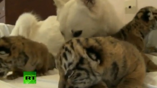 В сочинском зоопарке собака Телли приняла трех тигрят, брошенных своей матерью после рождения.