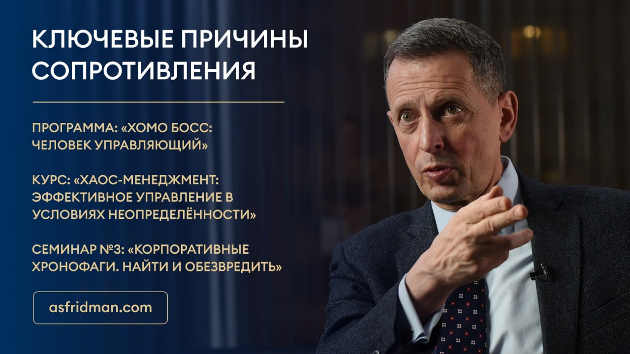 Ключевые причины сопротивления Программа: «Хомо Босс: Человек Управляющий» Курс: «Хаос-Менеджмент: Эффективное управление в условиях неопределённости» Семинар №3: «Корпоративные хронофаги. Найти и обезвредить» Расписание открытых семинаров Александра Фридмана: https://www.asfridman.com/raspisanie/