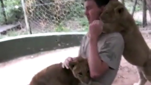 Львята обнимаются с человеком
