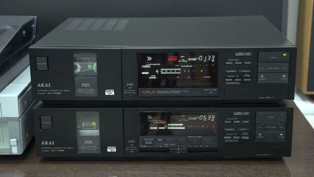 AKAI GX-R99 ¥168,000(1983年発売). テトラコードというコンセプトで録音能力の向上を図ったクイックリバースデッキ。 テトラコードは4つのイノベーションのことで、スーパーGX・3ヘッドリバース、ダブルキャプスタンbyツインDD、CRLP(Computer Recording Level Processing)、ハイチューンDCアンプの4点を重視した設計となっています。 ヘッド部にはスーパーGXヘッドを録音・再生で独立して使用しており、往復録再にはヘッドブロックを180度回転させるAccurate Reverseヘッドシステムを採用しています。 Accurate Reverseヘッドシステムでは、テープに対してヘッドの位置を高精度に保つため、ヘッドハウジング材にベリリウム配合の高硬度亜鉛ダイキャストを採用しています。通常の亜鉛ダイキャストに比べて2倍の硬度と8倍の耐摩耗性を示すこの素材に公差が数ミクロンという精密加工を施すことで高い精度を維持しています。 回転部には滑りの良いフッ素系樹脂を主体とする個体潤滑剤を使用しており、精密塗膜コントロール技術で数ミクロン厚にコーティングし、摩擦係数を大幅に下げ、連続200万回以上の耐久性を実現しています。また、往復両方向のアジマスを正確に保つため、ストッパー部に往復どちら側にも高硬度のファインセラミックス(純度99%以上のアルミナ)を採用しており、ヘッドの急回転に伴う衝撃1,000kg/cm2に22,000kg/cm2と余裕のある強度を確保し、長期にわたる耐摩耗性と耐衝撃性を保証しています。 ストッパーを受け止めるアジマス調整ネジにはステンレス鋼に焼入れ処理を施したファインスクリューを採用しており、硬度と緩衝性を両立させることで摩耗を抑え、内部のステンレスの弾性が衝撃を吸収します。さらに、長期使用で問題となる調整ネジの緩みにはダブルナット方式で対処しており、2重のナットで締め上げることでゆるみを確実にロックしています。 また、薄くて強靭なポリアミド樹脂にリード線をプリントしたロールアップフレキシブルプリントボードを採用しており、回転部では螺旋状に巻きあげたことでヘッドに回転負荷トルクがかからず、また低温時の硬化によるトラブルも防いでいます。 ヘッドの回転は摩擦係数の特に低いラックをモータードライブによって素早く左右にシフトさせるダブルピニオン駆動となっており、機構的に極めてシンプルな回転メカニズムを実現しています。 スーパーGXヘッドは、独自の加工技術によってローノイズ・クリスタル化に成功したフェライトヘッドで、これをヘッドコアとシールドコアに用い、全体を高硬度ガラスで固めた構造となっています。 このヘッドでは従来のフェライトヘッドが抱えていたノイズや粒子脱落などの難点を解決しており、さらに高域でのエディカレントロスが極めて少なく、高い透磁率とワイドな周波数特性を実現しています。また、ヘッドギャップの工作精度が非常に高くできるなどのメリットも持っています。 GX-R99ではスーパーGXヘッドを録音用と再生用に専用化して使用しており、高精度に一体化したコンビネーションタイプの3ヘッド方式となっています。録音用ヘッドのギャップは深いバイアス電流をかけても磁気飽和をおこさないよう4ミクロン幅とし、再生ヘッドのギャップは20kHz以上まで周波数特性を伸ばすため1ミクロン幅としています。 メカニズム部にはクローズドループ・ダブルキャプスタン方式を採用しており、さらにアカイ独自のBSP(Bi-directional Symmetrical Precision)メカニズムを採用することで往復走行特性の均一化を図っています。 クローズドループ・ダブルキャプスタン方式では2組のキャプスタンとピンチローラーでヘッド近辺のテープを挟み込むことでテープに一定のテンションを与えています。この方式ではリールなどからの外乱がシャットアウトできるためワウ・フラッター特性が向上し、さらにテープスパンを短くすることで走行にともなうテープの微振動を制御しています。また、テープの巻き始めから巻き終わりまで一定したテープテンションが得られるため、ヘッドタッチが安定化しています。 GX-R99ではクローズドループ・ダブルキャプスタン方式のメリットを最大限に引き出すため、テイクアップ側のキャプスタン径を2.3mm、サプライ側を2.5mmとわずかにキャプスタンの直径を変えており、回転周期の重なりによるワウの発生を防止しています。また、ピンチローラーのキャプスタン軸への圧着力をテープ走行方向の上流側で低く、下流側で高く調整しており、ループ内テンションの安定性をより高いものとしています。 フォワード側、リバース側の両方向で優れたテープ走行を実現すすため、両方にダイレクトドライブ方式を採用しています。 DDモーターにはフライホイールの厚みを十分にとって慣性モーメントを高めたブラシレス、コアレス、スロットレスのFGサーボ方式を採用しており、極めて高い回転精度を獲得しています。 ツインDDシステムはテイクアップ側のモーターが駆動され、サプライ側はベ