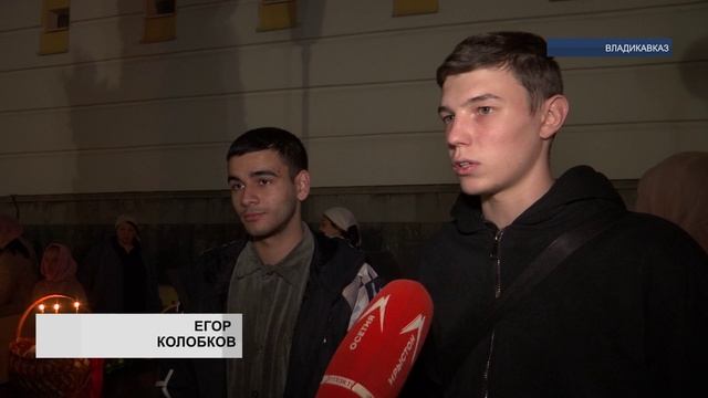Чудо, каждый год сходящее с небес. Благодатный огонь из Храма Гроба Господня в Иерусалиме ждут верующие в Соборе Великомученика Георгия Победоносца. Святой Свет из места, где, согласно преданию, был распят, погребён и воскрес Иисус Христос для них символизирует воскрешение Сына Божьего. Люди принесли куличи и яйца. Их, по традиции, осветили. Праздников праздник, торжество из торжеств, как говорят верующие. Воскрешение Иисуса есть основа веры христиан, а Пасха ничто иное, как победа жизни над смертью. Прийти и помолиться всей семьёй — истинный душевный порыв православных христиан. Службу возглавил архиепископ Владикавказский и Аланский Герасим. Рядом с родителями стоят дети, которые, может быть, не до конца, но всё-таки понимают величие происходящего. Во время Великого поста стараются не просто ограничивать себя в еде. Важно очистить душу от страстей, того, что мешает подумать на самом деле о важном. Воздерживались православные сорок дней. Традиции своей веры люди передают из поколения в поколение. Мамы учат дочек печь куличи и красить яйца. А ещё правильно молиться. Поистине светлый праздник Пасхи. Священнослужители поменяли чёрные одеяния на белые. А сам Свято-Георгиевский собор украсили живыми красными цветами. Они напоминают прихожанам о пролитой крови Иисуса Христа за искупление человеческих грехов. На богослужении много молодёжи. Одни пришли с родными, другие — в компании друзей, и всех объединила неподдельная вера в фантастичную жертвенность ради спасения людей. Благодатный огонь прямиком из самого почитаемого места христиан в Северную Осетию уже по традиции доставил депутат Госдумы Зураб Макиев. Отсюда его передали во все храмы республики и в Южную Осетию. Частичку Святого Света получил каждый желающий. Для людей это доказательство божественности. Верующие унесли зажжённые свечи и лампады домой, где они обязательно продолжат праздновать. С частицей благодатного огня и под православные песнопения сотни верующих совершили крестный ход вокруг Свято-Георгиевского собора. Люди будто идут навстречу Спасителю. В двенадцать часов ночи зазвенели колокола. Толпа остановилась перед закрытыми дверьми храма. Небольшая пауза и тут архиепископ произносит главные слова, которые так ждут христиане. Христиане верят, что смерть на земле не станет завершающей точкой. Природа человека преобразится по подобию Сына Божьего и будет бессмертной. Апостол Павел писал, "если Христос не воскрес, то и проповедь наша тщетна, тщетна и вера ваша", С лиц людей, которые всю ночь простояли на службе, не сходят искренние улыбки. В самый важный православный праздник они рядом с теми, кого по-настоящему любят. Что может быть дороже. "Христос Воскресе!" — этими словами верующие будут приветствовать друг друга ещё сорок дней, ровно столько после воскрешения из мёртвых Иисус являлся своим ученикам. А потом произошло Вознесение Господне на небо. Событие, которое, согласно Священному Писанию, произошло больше двух тысяч лет назад, вспоминают христиане по всему миру. А после Пасхи наступает Светлая Седмица. Церковь всю неделю советует радоваться, поздравлять родных, близких и знакомых, просить прощение у тех, кого обидел. Сквернословить, ругаться и завидовать, грустить и унывать нельзя. Пасха настолько величественная, что её празднование не вмещается в
