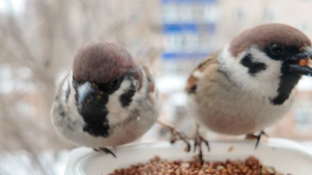 Воробьи в кормушке на окне