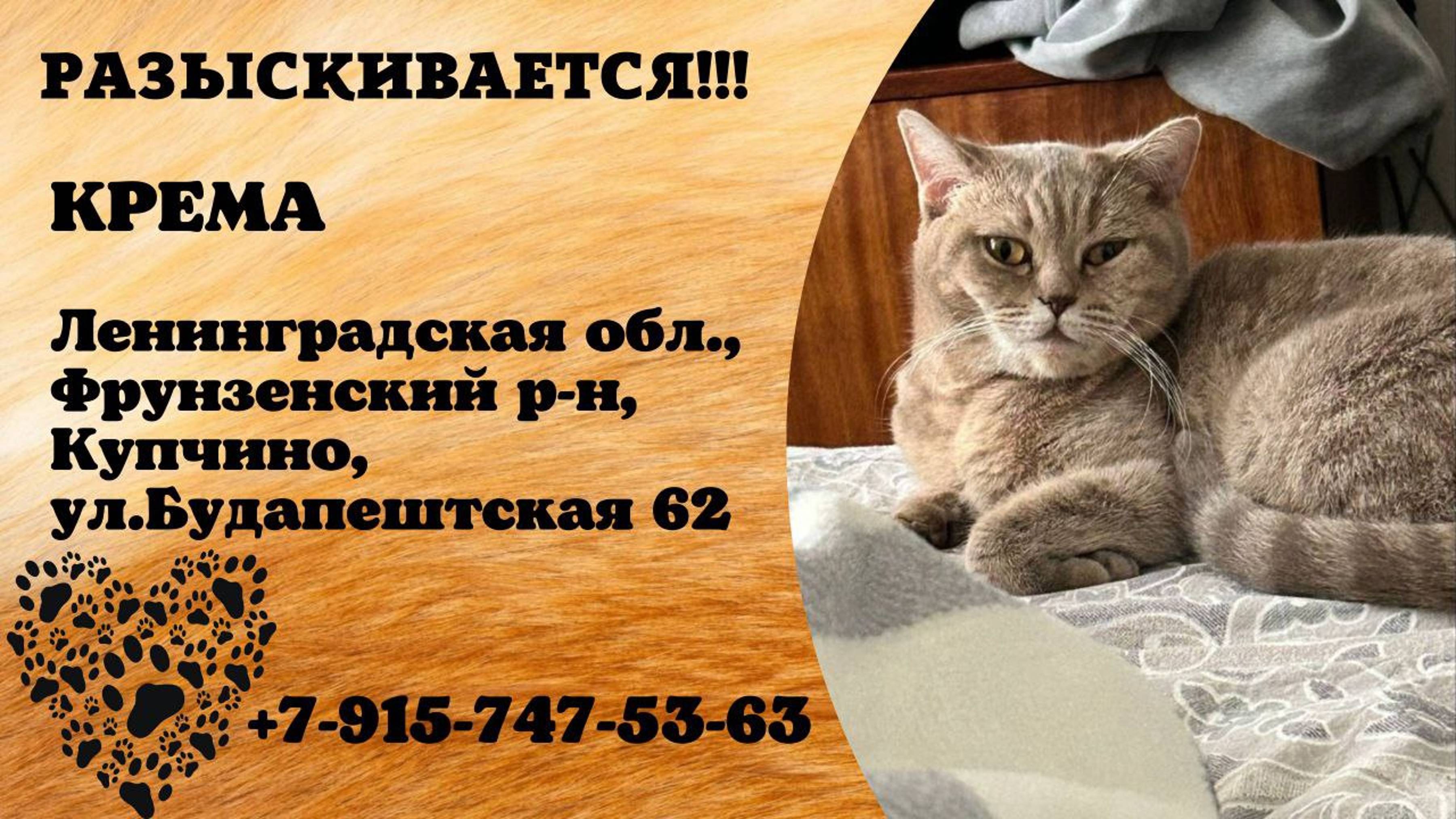 Пропала кошка! КРЕМА. Ленинградская обл, Фрунзенский р-н, Купчино