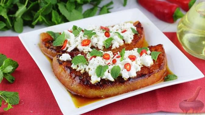 Солоноватая брынза отлично гармонирует со сладковатой арбузной мякотью. Листики мяты добавляют аромат и свежесть готовому блюду, а колечки перца чили - свою особенную огненную изюминку. #БлюдаИзАрбуза #АрбузССыром #НаГриле #ЛетниеЗакуски