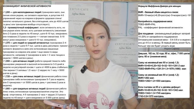 Тайм-коды: 1) 00:00 Дефицит на похудении; 2) 2:06 Оптимальное снижение веса; 3) 3:17 Нарушения в организме на стрессовой диете; 4) 4:25 Почему мышцы выгодны для организма; 5) 6:54 Как набрать витамины и минералы; 6) 8:20 Зачем нужен биоимпеданс? 7) 10:16 Низкожировые диеты: чем опасны; 8) 15:25 Похудение и обвисшая кожа; 9) 16:38 К чему ведет набор лишнего жира, животик? 10) 18:01 Пример расчета калорийности по формуле; 11) 20:37 Как выбрать коэффициент физактивности; 12) 27:35 Расчеты поддержания/дефицита с разными способами. Расчет еще есть в этом посте: https://t.me/fitnessmaria/4449 КОЭФФИЦИЕНТЫ ФИЗ.АКТИВНОСТИ: 👍❤️ Для расчета суточных энерготрат умножаем полученный результат на КФА – коэффициент физической активности: • 1,200 — для малоподвижных людей (тренировок мало, они легкие и/или редкие, не силового характера, а допустим 4-5 упражнений через на коврике в формате здоровая спина/пилатес начального уровня, без отягощения, или до 4000 шагов в день/ или тренировки вообще отсутствуют); • 1,3 - промежуточный коэффициент, если активность есть, но она редкая и/или легкая, есть шаговая активность (несиловая йога 2-3 раза в неделю по 45 минут, шаги 6-10 тыс. ежедневно; или плавание 2-3 раза в неделю + + легкая гимнастика 5-10 минут дома ежедневно + шаги 6-10 тыс. ежедневно). • 1,375 — для людей со средней активностью (тренировки 2–4 раза в неделю + шаги 5-7 тыс. шагов в день регулярно; тренинг силового формата в зале или интенсивные серьезные тренировки на коврике или дома + еще какие-то виды активности, например 2 тренировки в зале + 3 часа танцев в неделю + 5000 шагов в день); • 1,550 — для активных людей (работа средней тяжести либо тренировки умеренной и высокой интенсивности 3–5 дней в неделю на регулярной основе + шаги от 4000 в день стабильно. Как вариант 3 силовых 1,5 часа + 2 кардио по 1 часу + 5000 шагов в день); • 1,725 — для очень активных людей (физическая работа плюс тренировки либо интенсивные тренировки 5–7 раз в неделю; или 5 тренировок + от 5000 шагов в день + растяжка 2 раза в неделю); • 1,900 — для предельно активных людей (физическая работа плюс очень интенсивные тренировки/занятия спортом. Это проф. спортсмены, 4-5 тренировок 2 часа + кардио 2-3 раза в неделю по 45 минут + шаги ежедневно от 5 000 шагов /день). Отеки: как убрать: https://www.youtube.com/watch?v=hMG10c6k6Wg Отеки. Видео №2: https://www.youtube.com/watch?v=2OnagPezw6w&t=901s Как рассчитать углеводы: https://www.youtube.com/watch?v=DTN4kpLlmGY&t=177s Мой Телеграм: https://t.me/fitnessmaria Мой сайт: https://maria-safina.ru/ Запись на мой авторский курс «Искусство Здорового Рациона»: https://maria-safina.ru/iskusstvo-zdorovogo-raciona Марафон Здоровых Привычек Марии Сафиной: https://kurs.maria-safina.ru/marafon-zdorovyh-privychek-marii-safinoj Запись на мой авторский курс «Пищевые Жиры и Здоровье»: https://kurs.maria-safina.ru/kurs-pishchevye-zhiry-i-zdorove Мои сертификаты и дипломы: http://maria-safina.ru/obo-mne Бесплатная книга «Искусство Здорового Рациона» на Литрес: https://www.litres.ru/book/mariya-safina/iskusstvo-zdorovogo-raciona-dokazat
