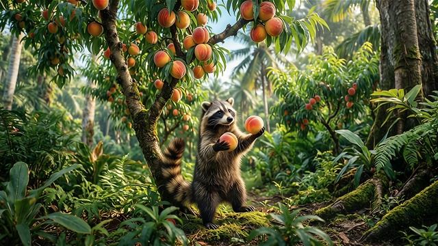 Енот, танцующий с персиками