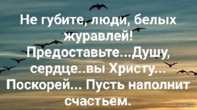 ХРИСТИАНСКИЕ ПЕСНИ ДЛЯ ХВАЛЫ И ПОКЛОНЕНИЯ ПРОСЛАВЛЕНИЯ ВООДУШЕВЛЕНИЯ #господь#музыка#христианская_музыка#музика#христианскиепесни#бог#христианскиестихи#любовь#христианство#стихи#песня#песни#иисус#иисусхристос#иисусмойбог#иисус_христос#иисусбог#иисусгосподь#хвалы_и_поклонения#хваление#хвала#прославление "НЕ ГУБИТЕ, ЛЮДИ, БЕЛЫХ ЖУРАВЛЕЙ!" СЛОВА, МУЗЫКА: ЖАННА ВОЛКОВА-ВАРЛАМОВА Стихи Жанна Волкова(Варламова) Припев: Не губите, люди, белых журавлей! Их на свете мало. Благородней птицы нет... Ведь она - сакральна. Красотой своей она Душу согревает... И, ликует дух внутри... Радость наполняет. Припев: Не губите, люди, белых журавлей! Предоставьте...Душу, сердце..вы Христу... Поскорей... Пусть наполнит счастьем. Счастье, радость и успех Люди ожидают. И, увидев журавля , По нему стреляют. Припев: Не губите, люди, белых журавлей! Ведь, он - символ счастья! Он - источник доброты... И, приносит радость. Красота Христа меня изнутри меняет... Как сакральная звезда от беды спасает. Припев: Не губите, люди, белых журавлей! Предоставьте...Душу, сердце..вы Христу... Поскорей... Пусть наполнит счастьем. Счастье, радость и успех Люди ожидают. И, увидев журавля , По нему стреляют. Счастье, радость и успех Люди ожидают. И, увидев журавля , По нему стреляют. Не губите, люди, белых журавлей! Ведь, он - символ счастья! Он - источник доброты... И, приносит радость. Красота Христа меня изнутри меняет... Как сакральная звезда от беды спасает. 11.08.2018 Жанна Волкова-Варламова
