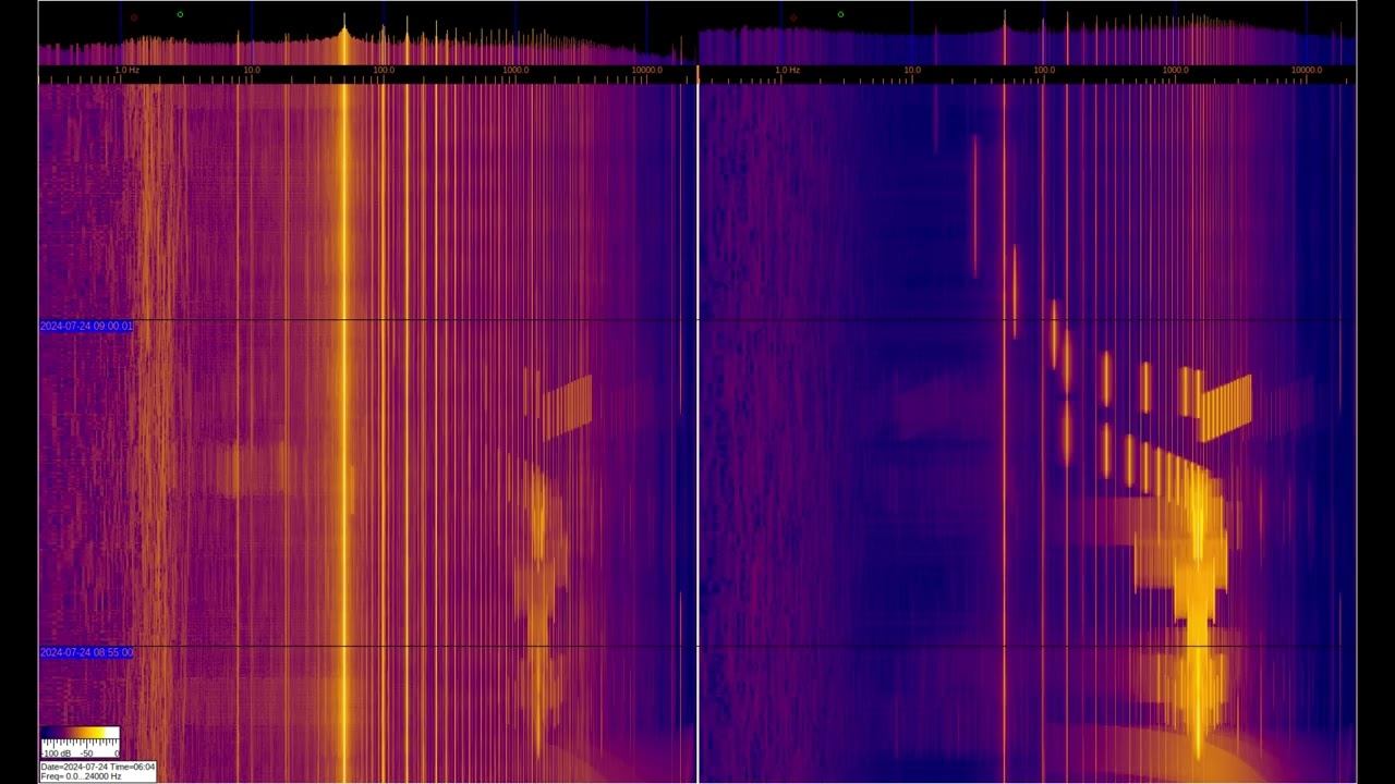 Левый и правый сигналы снимаются с индуктивных датчиков с ферромагнитными элементами, но левый соеденён дополнительно с заземлением на 2-х штырях из нержавеющей стали заглублённых на 1м и отстоящих друг от друга на 1м. Можно видеть большое количество гармоник от электросети и различные искуственные сигналы. Интерес представляют сигналы на частотах ниже 50Гц, где можно наблюдать работу специализированной аппаратуры и сигналы связи подводных лодок и подъземных объектов. Отдельно стоит рассматривать сигналы в районе 1-3Гц на левом спектре, которые относятся к геомагнитному фону, который модулируется солнечной активностью, более детально их можно рассмотреть в видео под названием "Сигналы из Земли", которые есть в плэйлистах ниже. О ПРОИСХОЖДЕНИИ ЧАСТОТНОЙ МОДУЛЯЦИИ СЕРПЕНТИННОЙ ЭМИССИИ https://youtu.be/bwWHggY1IVU?si=xAX1diRKI9MxQJ88&t=1740 Previous monitoring is in playlists: EMF monitor https://youtube.com/playlist?list=PLiRg2YCbXcwn41BHqADKVBep_TgVq6XUN Очень Низкая Частота ~ Very Low Frequency https://youtube.com/playlist?list=PLiRg2YCbXcwnp5DxM4PnSs7k_Rnypaqek SIGNALS IN THE GROUND https://youtube.com/playlist?list=PLiRg2YCbXcwl6f3Bf5arHbGSOCNE5U71O поддержать канал: 8-999-654-93-44