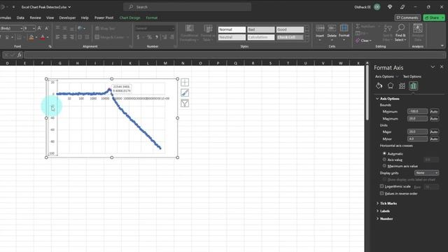 Welcome to electrical engineering with Excel. In this short video, we will make a peak detector, on an Excel chart. Often when analyzing data from a measurement input, it’s useful to know the maximum value of the data. 00:00 Intro 00:30 Start with a Simple Data Series 00:57 Creating Formula for Returning Peak Value 01:42 Excel Plots #NA Cells as Blanks 02:31 Fomatting Peak Marker 03:17 Pasting in Data and Formatting Chart 03:56 Formatting Frequency Numbers with SI Prefixes 05:10 Formatting the Data Callout 05:32 Adding Minor Gridlines and Dynamic Axis Titles