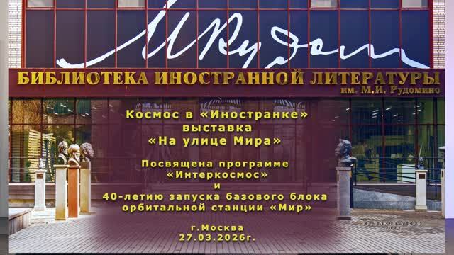 00:00 - доклад исполнительного директора АМКОС 04:47 - генеральный директор ФГБУК 07:33 - приветственный ролик космонавта 13:52 - Открытия выставки «На улице Мира», посвящённой программе «Интеркосмос», и 40-летию запуска базового блока орбитальной станции «Мир», встреча с участниками международной программы. https://rutube.ru/video/1b5e54c371f7859161fcb79cf802f6e1/?r=wd https://rutube.ru/video/59f1143834c799c3899290717269dc57/?r=wd Почетным гостем выставки стал Владимир Джанибеков, лётчик-космонавт СССР, генерал-майор авиации, дважды Герой Советского Союза. г.Москва 27.03.2026г. Автор видео: Александр Яскевич (belenkur)