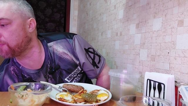 Жареная домашняя колбаса луком, томатом и яйцами. Мукбанг, еда на камеру.