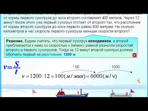 6 класс. Арифметический способ. По морю параллельными курсами в одном направлении следуют два сухогруза: первый длиной 120 метров, второй — длиной 80 метров. Сначала второй сухогруз отстает от первого, и в некоторый момент времени расстояние от кормы первого сухогруза до носа второго составляет 400 метров. Через 12 минут после этого уже первый сухогруз отстает от второго так, что расстояние от кормы второго сухогруза до носа первого равно 600 метрам. На сколько километров в час скорость первого сухогруза меньше скорости второго?