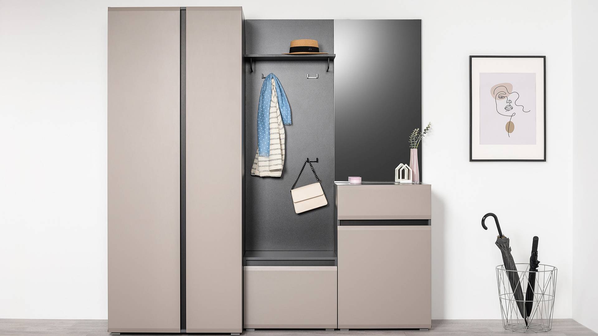 Сидней – стильная и функциональная прихожая, которая масштабируется под любую площадь помещения и высоту потолков. Минималистичные фасады в трендовом цвете без лицевой фурнитуры открываются за край либо нажатием (push-to-open). Большой выбор модулей: высота шкафов от 2050 до 2400 мм и полноразмерная глубина позволит максимально использовать полезное пространство. Вместительная система для хранения одежды, обуви и хозяйственных принадлежностей.