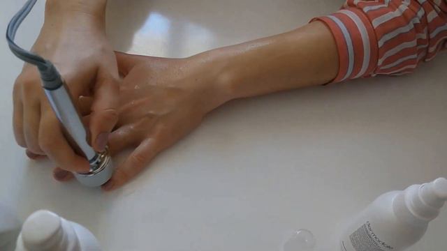 После этого ухода с MESOFORM PRO кожа рук более плотная, упругая, очень хорошо осветляется пигментация. Улучшается крово и лимфоток, поэтому руки легкие, как крылья бабочки. Протокол (все средства профессиональная косметика dermadiale): 1.Тоник с АНА -тонизируем кисти рук (тыльную сторону и ладони) 2. Филлер с фрагментированной гиалуроновой кислотой наносим на тыльную сторону кисти легкими вбивающими движениями до полного впитывания 3. Дезинкрустант гель наносим и работаем: в режиме (-) 1,5 минуты (делаем 5 проходов) в режиме (+) 1,5 минуты (делаем 5 проходов) в режиме (+/-) 1,5 минуты (делаем 5 проходов) 4. Переходим на ладонь , наносим дезинкрустант и повторяем. 5. Тоже самое повторяем на правой руке. 6. Остатки средств смываем и наносим флюид фотопротектор spf 50? если выходим на солнце после процедуры. Курс от 5 до 10 процедур, можно делать каждый день. Обязательно сделайте курс и напишите нам как ваши руки.... На видео MESOFORM PRO ADVANCE для самостоятельного ухода, для профессионалов выпускается версия PROFESSIONAL.