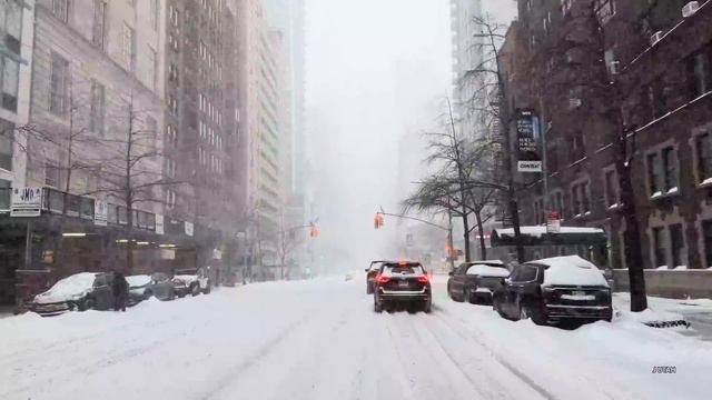 Поездка по центру Нью-Йорка в метель выглядит как движение сквозь «белую пелену». Из-за порывистого ветра до 80 км/ч видимость на Таймс-сквер и Пятой авеню периодически падает до нуля, а температура по ощущениям достигает -30°C. Дороги в Мидтауне сужены из-за обледенелых сугробов, оставшихся после недавних штормов, что превращает обычный маршрут в медленное лавирование между ледяными глыбами. Несмотря на работающую снегоуборочную технику, движение сильно затруднено, а власти города настоятельно рекомендуют оставаться дома из-за риска мгновенного обморожения.