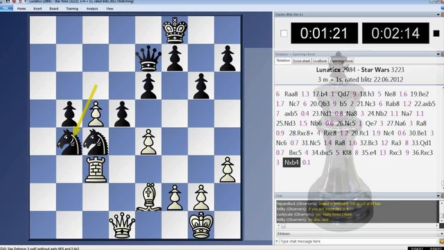 Lunaticx vs Star Wars (Hikaru Nakamura) rated chess blitz on Playchess.com