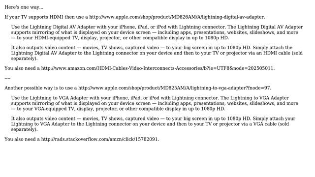 Apple: Display photos from iPad on TV without Internet connection Helpful? Please support me on Patreon: https://www.patreon.com/roelvandepaar With thanks & praise to God, and with thanks to the many people who have made this project possible! | Content (except music & images) licensed under CC BY-SA https://meta.stackexchange.com/help/licensing | Music: https://www.bensound.com/licensing | Images: https://stocksnap.io/license & others | With thanks to user user3439894 (apple.stackexchange.com/users/115523), user tcdaly (apple.stackexchange.com/users/177609), user bmike (apple.stackexchange.com/users/5472), user Allan (apple.stackexchange.com/users/119271), and the Stack Exchange Network (apple.stackexchange.com/questions/233065). Trademarks are property of their respective owners. Disclaimer: All information is provided "AS IS" without warranty of any kind. You are responsible for your own actions. Please contact me if anything is amiss at Roel D.OT VandePaar A.T gmail.com