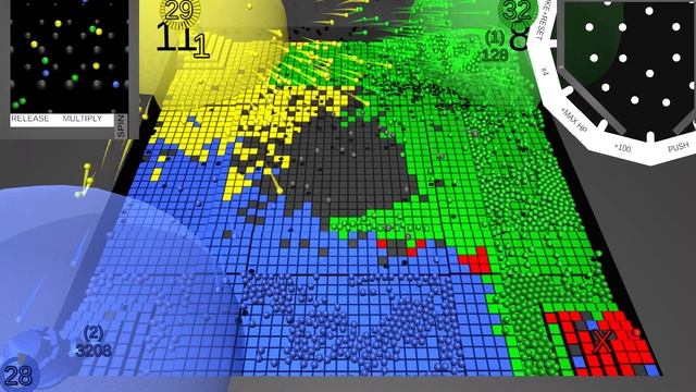 A battle simulation controlled by the random movement of marbles. Each player's marbles can enter either the Multiply trigger, which doubles their current number, or Release, which launches a number of shots equal to their current number and resets it to 1. The last player standing wins. Simulation made using Unity https://unity.com/