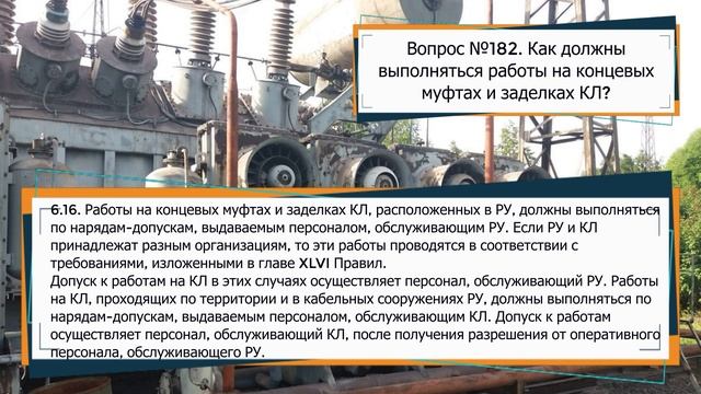 Как должны выполняться работы на концевых муфтах и заделках КЛ? 6.16. Работы на концевых муфтах и заделках КЛ, расположенных в РУ, должны выполняться по нарядам-допускам, выдаваемым персоналом, обслуживающим РУ. Если РУ и КЛ принадлежат разным организациям, то эти работы проводятся в соответствии с требованиями, изложенными в главе 46 XLVI Правил. Допуск к работам на КЛ в этих случаях осуществляет персонал, обслуживающий РУ. Работы на КЛ, проходящих по территории и в кабельных сооружениях РУ, должны выполняться по нарядам-допускам, выдаваемым персоналом, обслуживающим КЛ. Допуск к работам осуществляет персонал, обслуживающий КЛ, после получения разрешения от оперативного персонала, обслуживающего РУ. 📌Благодарность админу на кофе можно закинуть на карту Сбербанка 2202 2021 3048 9523 (получатель Екатерина Васильевна). СПАСИБО! 📌ОХРАНА ТРУДА ТУТ https://www.youtube.com/playlist?list=PLtR4tdoyiT5ux16_nV8uegS2110jNLNLx 📌Стань спонсором и получи приятные бонусы: https://www.youtube.com/channel/UC1XTANu0XMZ776F_dHbRJQw/join 📌Мы в одноклассниках https://ok.ru/kanal.energo 📌Мы в контакте https://vk.com/kanal_energo 📌Мы в ЯД https://zen.yandex.ru/electricity 📌Мы в инстаграм https://www.instagram.com/energo2016/ 📌Заказ рекламы на канале https://vk.com/nurievtimur
