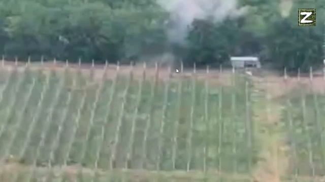 Боевая работа 152-мм колесной САУ 2С44 «Гиацинт-К» с дополнительным антидроновым бронированием.