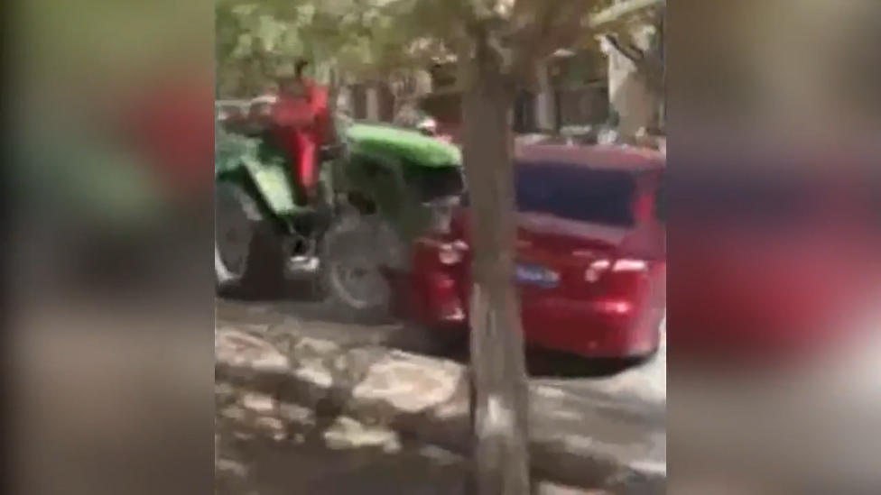 В жизни тракториста явно произошло что-то невероятное, после чего он решил немного поиграть с припаркованными автомобилями. А может быть это стоп хам на китайский манер, просто у парня наклейки закончились. ))
