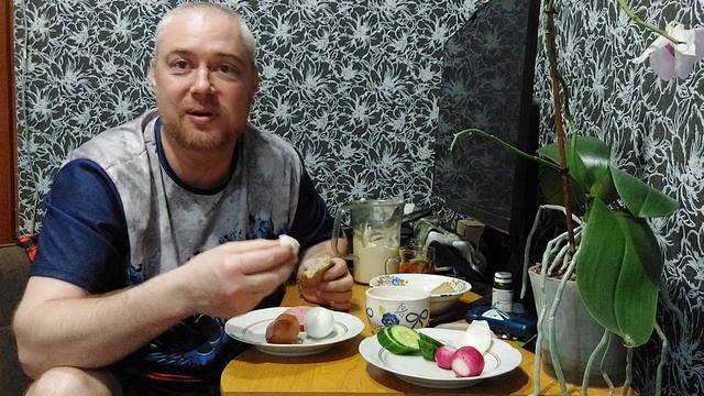 Мукбанг. Варёные яйца с сардельками, огурцами и редиской.