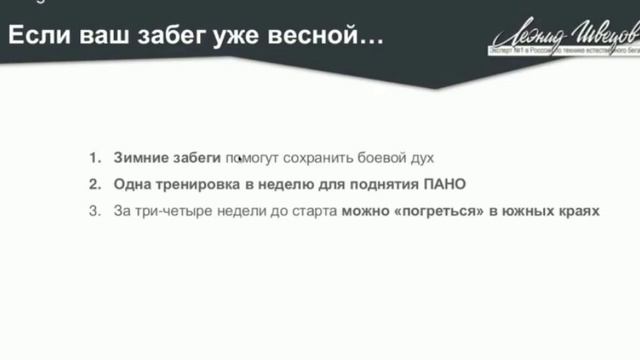 40% бегунов перестают бегать зимой, и это является критической ошибкой. Восстановление прежнего темпа и состояния организма может занять до нескольких месяцев. Как продолжить тренировки, улучшить технику бега и МПК, а также многие другие вопросы Леонид Швецов затронул в вебинаре "Межсезонье - есть ли бег зимой?". Вебинар от 2015 года, но бег за это время не поменялся. ССЫЛКИ ИЗ ВИДЕО: Программа постановки техники бега: https://run.leonidshvetsov.ru/start Кэмп: https://vk.com/leonidshvetsov?w=product-83793395_6718035%2Fquery Видеоанализ техники бега: https://vk.com/leonidshvetsov?w=product-83793395_6770813%2Fquery ТАЙМКОДЫ: 00:00:00 Как мы готовимся к межсезонью 00:00:20 Проблемы бегуна зимой 00:01:06 Причины бегать зимой 00:03:13 Что значат 3-4 недели перерыва 00:06:38 Максимальное Потребление Кислорода 00:09:17 Ваша стратегия на зиму 00:14:15 Базовые беговые упражнения зимой 00:20:18 Чем заняться бегуну в фитнес-клубе 00:22:37 Упражнения на тредмиле 00:27:00 Круговые тренировки 00:28:50 Замечание про тредмил 00:32:04 Если готовитесь к весеннему старту 00:35:20 Польза лагеря до забега (актуальный кэмп в описании) 00:36:42 Альтернатива бегу зимой 00:40:02 Наконец про одежду — слои одежды 00:41:44 Кисти и голова — как одевать 00:42:42 Кремы для лица 00:43:14 Обувь 00:45:14 Курс естественного бега (в описании) 00:48:43 Программа курса (обновленная программа на сайте) 00:51:35 В южных краях по пляжу бегать босиком или в кроссовках? 00:53:24 Про индивидуальный тренинг и программы 00:54:25 Будет ли подобный курс дальше 00:55:08 Как правильно дышать на морозе 00:57:00 Тем, кто был на семинаре, есть смысл идти на программу? 00:57:57 Когда начинать бегать после укола 00:58:37 Кроссовки с шипами 00:59:30 Бег в манеже 01:00:30 Не надо бегать зимой в шиповках 01:01:04 Сколько времени занимает подготовка к зимнему полумарафону 01:02:05 Бег на 100км и смерть ног, техника бега 01:03:14 Дыхание только носом 01:03:50 Только манеж или чередование с улицей? 01:04:47 Где в Саратове манеж 01:05:10 Про семинары 01:05:43 Про постановку техники и большие объёмы 01:06:10 Развитие ПАНО 01:07:02 Забиваются ноги, организм чувствует себя хорошо — проблема в технике? 01:08:00 Особенность в питании бегунов до и после тренировки 01:09:05 Разница в подготовке к марафону и экзамену Социальные сети: TG: https://t.me/running_school VK: https://vk.com/leonidshvetsov Леонид Швецов: — Мастер спорта международного класса, — Двукратный участник Олимпийских игр, — Экс-рекордсмен России в марафонском беге, — Действующий мировой рекордсмен в ультрамарафоне на 90 км, — Высшее медицинское образование по специальности "Лечебное дело. Врач ЛФК, физиотерапии и спортивной медицины"