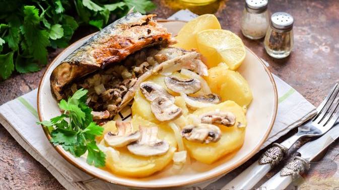Отлично в праздник! СКУМБРИЯ, ЗАПЕЧЁННАЯ С ГРИБАМИ И КАРТОШКОЙ