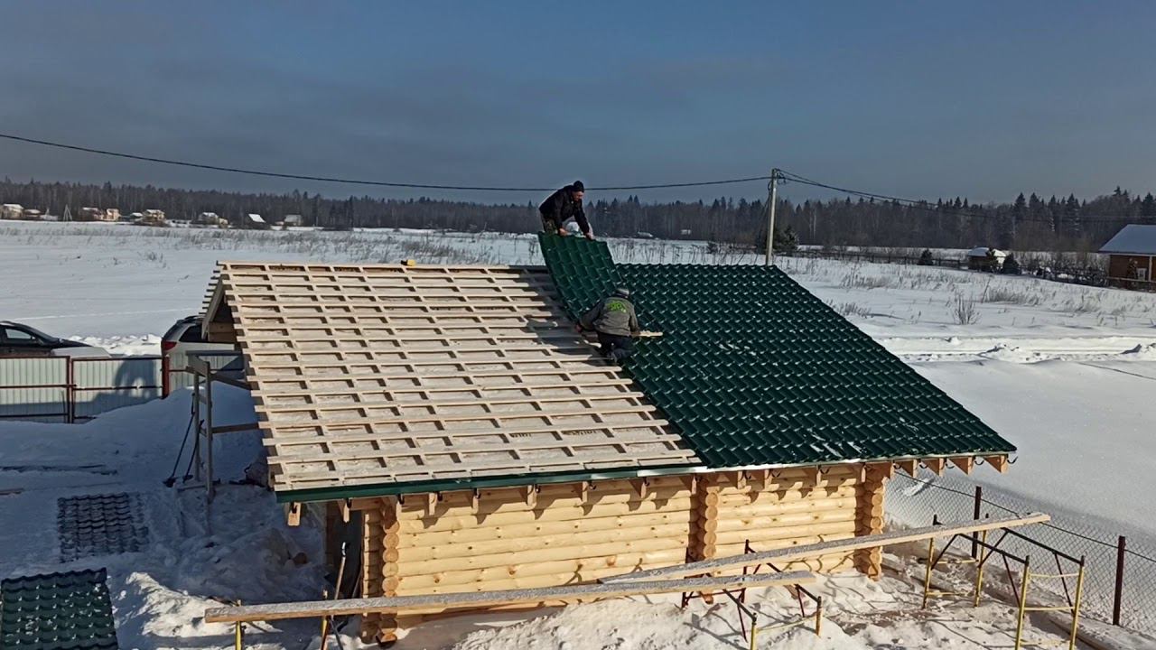 Монтаж металлочерепицы гаража из бревна #1116