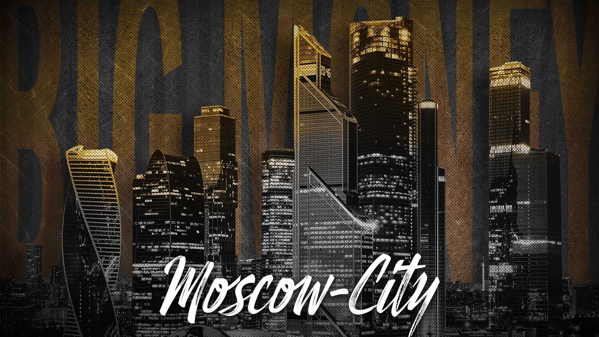 Создаю картину в современном стиле Москва-Сити, на заднем плане надпись большие деньги ? на русском серым цветом и золотым на английском