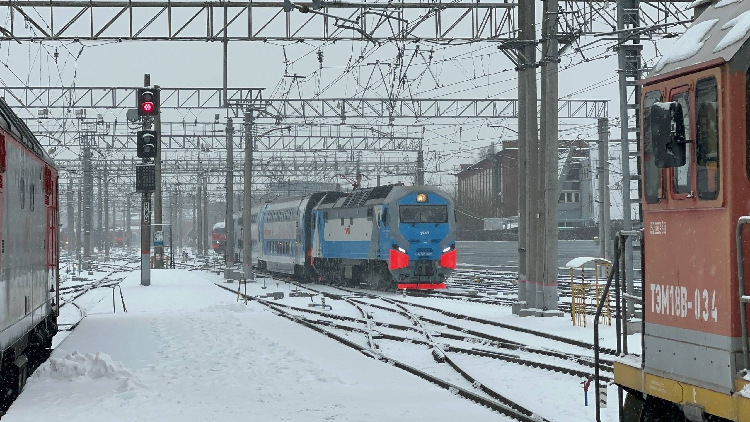 Электровоз ЭП2К - 503 с поездом "Аврора" на Московском вокзале, февраль 2025 года