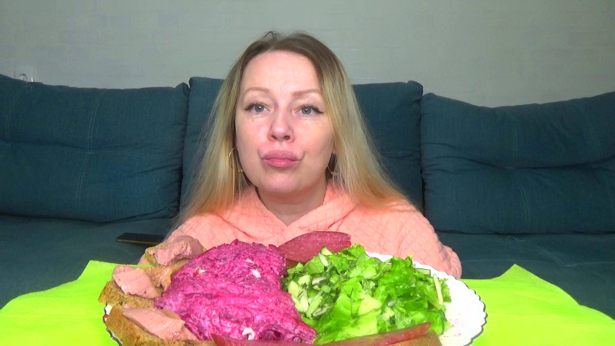 Мукбанг селедка под шубой, бутерброды с колбасой, салат овощной зеленый. Еда на камеру.