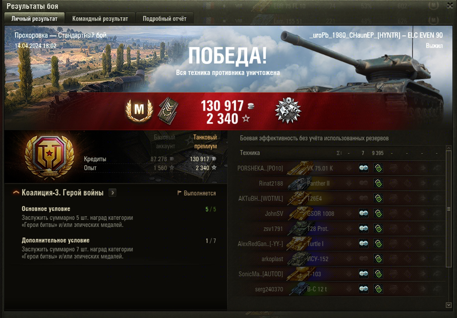 ПРОХОРОВКА МАСТЕР на ELC EVEN 90 ОПЫТ: 1418 СУММАРНЫЙ УРОН: 9395 медаль ДОЗОРНЫЙ