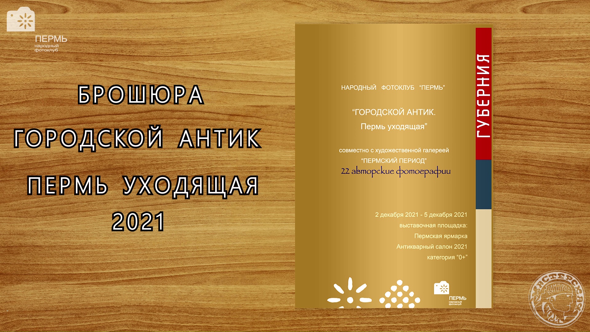 #Пермь #художественнаягалереяпермскийпериод #краеваяассоцияцияфотохудожников #галереяпермскийпериод #ПДНТГуберния #Пермьуходящая #слайдшоуназаказ #видеомонтажназаказ #народныйфотоклубПермь #художественнаягалереяпермскийпериод #КАФНФКПермьПДНТГуберния Брошюра Городской антик. Пермь уходящая (2022) с работами с выставки «Городской антик. Пермь уходящая». Так называется совместный проект художественной галереи «Пермский период» и Народного Фото Клуба ПЕРМЬ ПДНТ «Губерния», подготовленный специально для выставки «Антикварный салон» 2021. В экспозиции представлены живопись и графика пермских художников, отражающие историю города, а также работы пермских фотохудожников, сюжеты которых – те же улицы и здания Перми, что и на картинах, но запечатленные практически вчера – в конце ноября 2021 года.