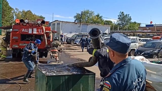 ?Команда 11 пожарно-спасательной части 8 пожарно-спасательного отряда ФПС ГУ МЧС России по Хабаровскому краю на соревнованиях выполняет боевое развертывание. Сотрудники именно этой части стали победителями состязаний в гарнизоне Комсомольска-на-Амуре.